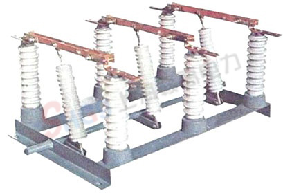 本系列隔離開關(guān)為三相聯(lián)動式,由底架、轉(zhuǎn)軸及聯(lián)動板、支柱絕緣子、導(dǎo)電閘刀及靜觸頭等部分組成。轉(zhuǎn)軸裝在底架上,軸上焊有聯(lián)動板,通過拉桿絕緣子(GN2-40.5T型用環(huán)氧玻璃布板絕緣桿)與閘刀相連。轉(zhuǎn)軸兩端伸出底架,其任何一端均可與操動機構(gòu)相連進(jìn)行分、合閘。本系列隔離開關(guān)可以水平、垂直或傾斜安裝。GN2-40.5T型為統(tǒng)一設(shè)計產(chǎn)品。結(jié)構(gòu)