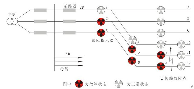 由2#線B相2、5、8指示器和2#線C相3、6、9指示器翻紅牌顯示而11指示器和12指示器仍為白色,即可判斷出D點(diǎn)發(fā)生短路故障