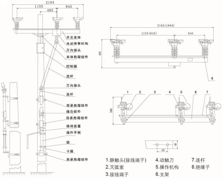 該隔離負(fù)荷開關(guān)由隔離閘刀、滅弧室及操動(dòng)機(jī)構(gòu)等部分組成。采用壓氣產(chǎn)氣滅弧原理,具有結(jié)構(gòu)簡(jiǎn)單、少維護(hù)、滅弧能力強(qiáng)、斷口絕緣水平高、可靠性高等優(yōu)點(diǎn),達(dá)到國外同類產(chǎn)品的水平。